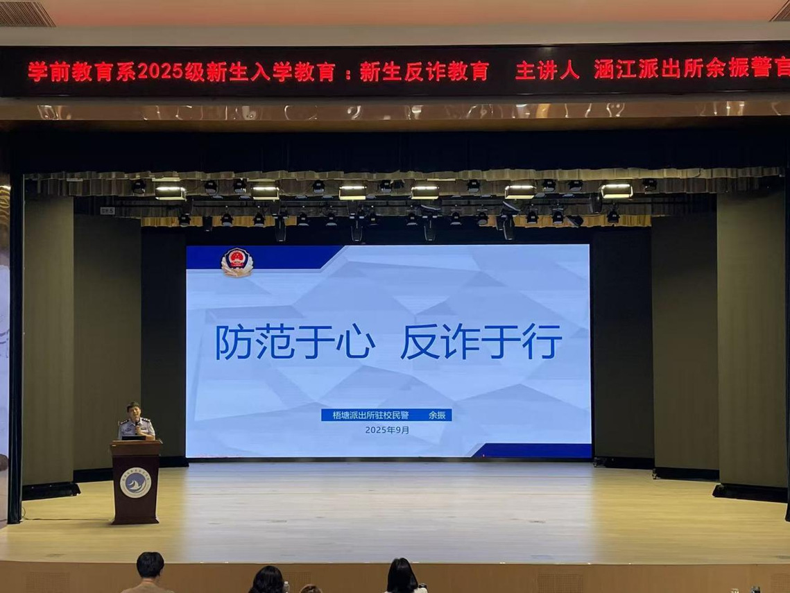 为帮助2025级新生尽快适应大学环境、开启人生新篇章,9月23日上午,学前教育系在立言大礼堂举行新生入学教育大会。本次教育聚焦新生实际需求,围绕防范电信诈骗,通过专题讲座为新生送上了一份实用、全面的“反诈指南”。